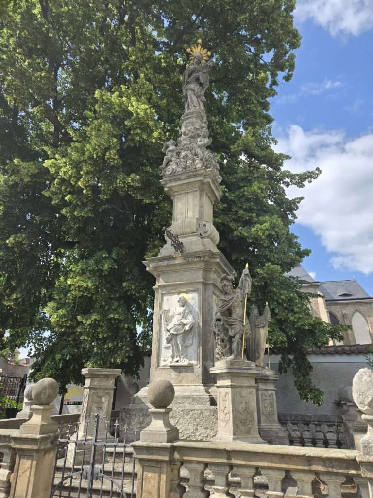Plague Column (Marian Column) — Baroque column by Baugut on Šultysova Street; background from GASK’s Jesuit College history. Learn more