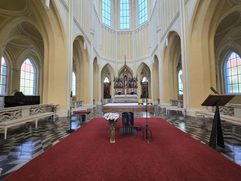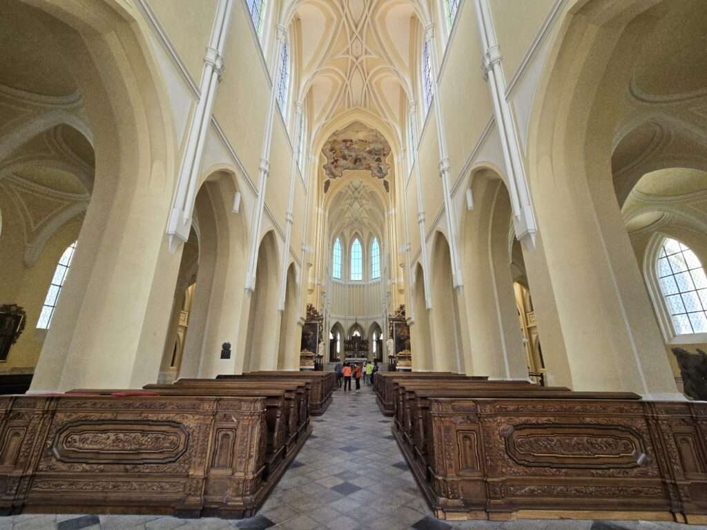 Our final stop in Kutna Hora was the Cathedral of the Assumption of our Lady and St. John the Baptist. After everything else we’d seen that day, it felt a bit underwhelming by comparison. It’s probably better to start your day here than end it. Either way, it’s still worth a quick visit—with a treasure hunt for details. Its blend of Gothic and Baroque is unique and part of why it’s on the UNESCO World Heritage list. It also boasts a few accolades: it’s often cited as the longest church in the Czech Republic, it houses the oldest Gothic monstrance in the world, and it holds three original Petr Brandl paintings. You’ll be in good company too, given how many rich and powerful figures have passed through over the centuries. The site once included a monastery—those grounds now belong to the tobacco factory.