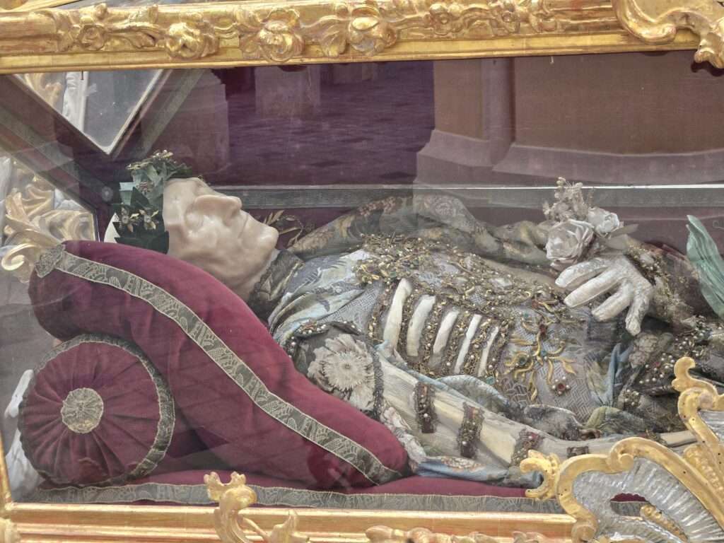 It’s also fascinating why there were so many bones here in the first place. A Cistercian abbot brought a jar of earth from the site of Jesus’s crucifixion and scattered it over the cemetery, making this a coveted place to be buried. Then the plague brought many deaths and overfilled the cemetery, creating the need for an ossuary. The ornate arrangements didn’t come until the late 19th century—long after these people died. They had clamored to be buried in “holy” soil, yet they ended up above ground as art installations.